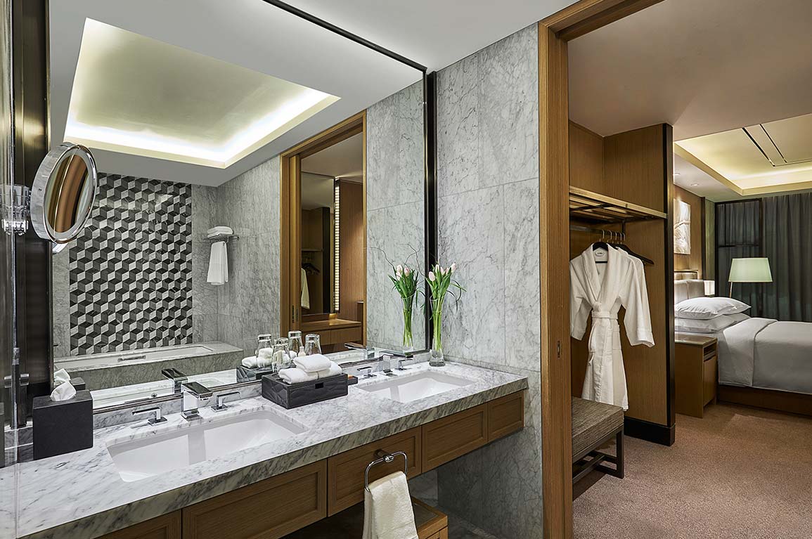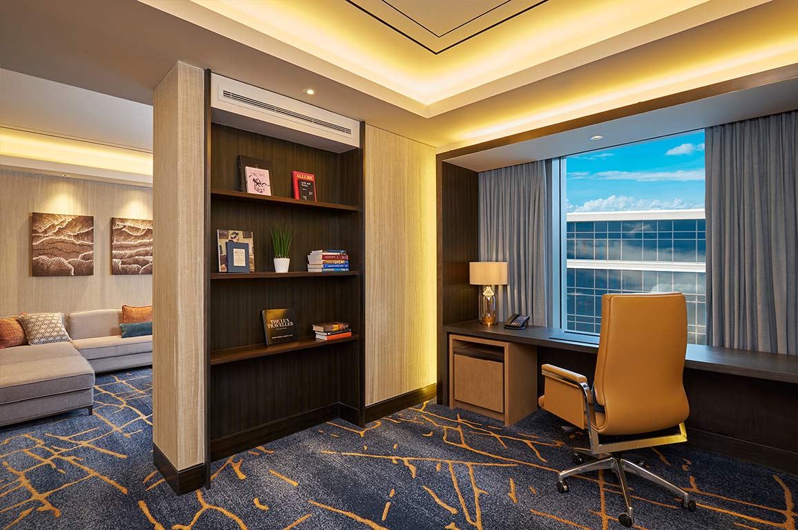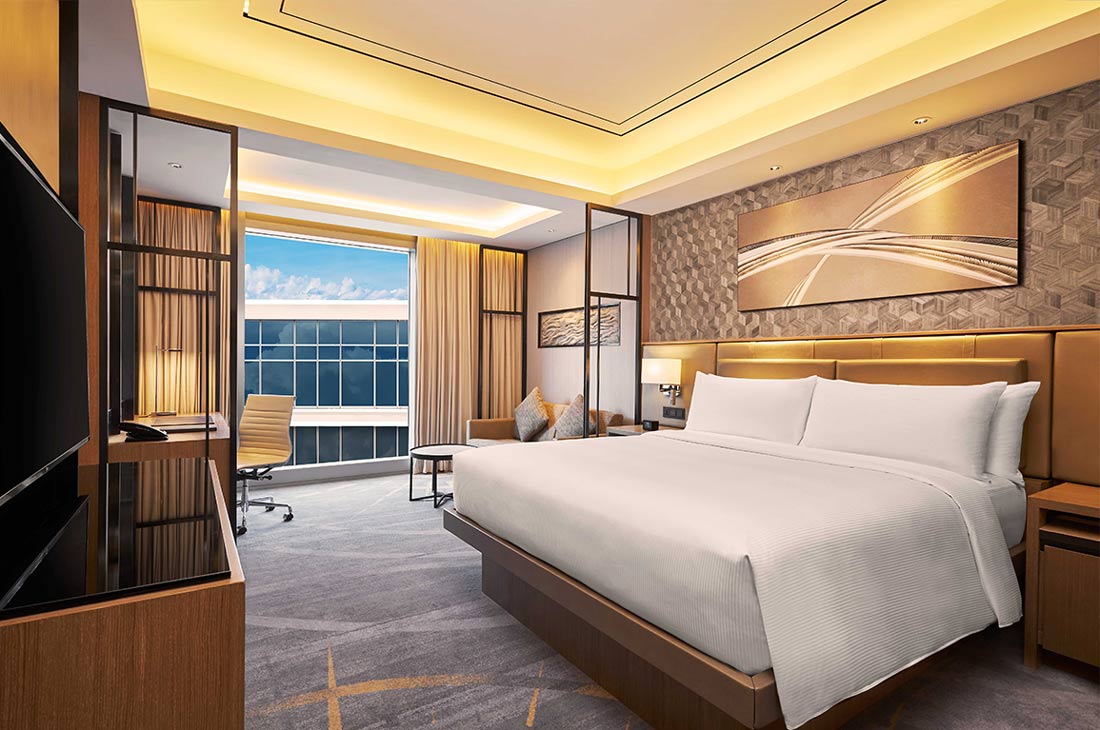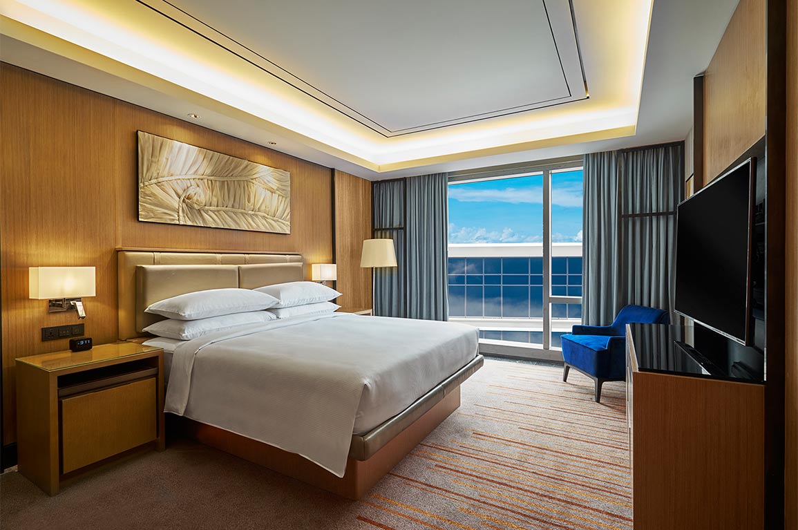 Enter the room with ease using Hilton’s Digital Key that’s equipped with “direct-to-room” or keyless technology via the Hilton Honors app. Stay in and feel like royalty at one of their 357 modern and elegant guest rooms, furnished with Hilton’s signature features. Lay every worry to rest on the plush Serenity bed, and wash the day off at the four-point bathroom comprised of a vanity area, toilet, and separate bathtub and rain shower.