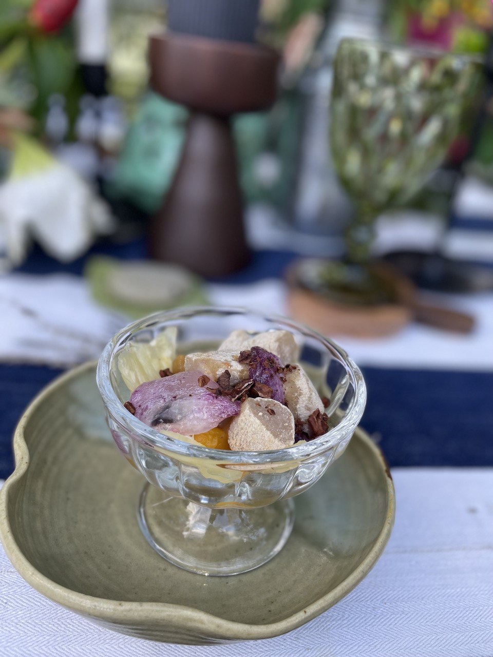 Fruit Salad of Caimito, Mango, Pineapple, and Chico with Bicol Roasted Cacao Nibs and Espasol