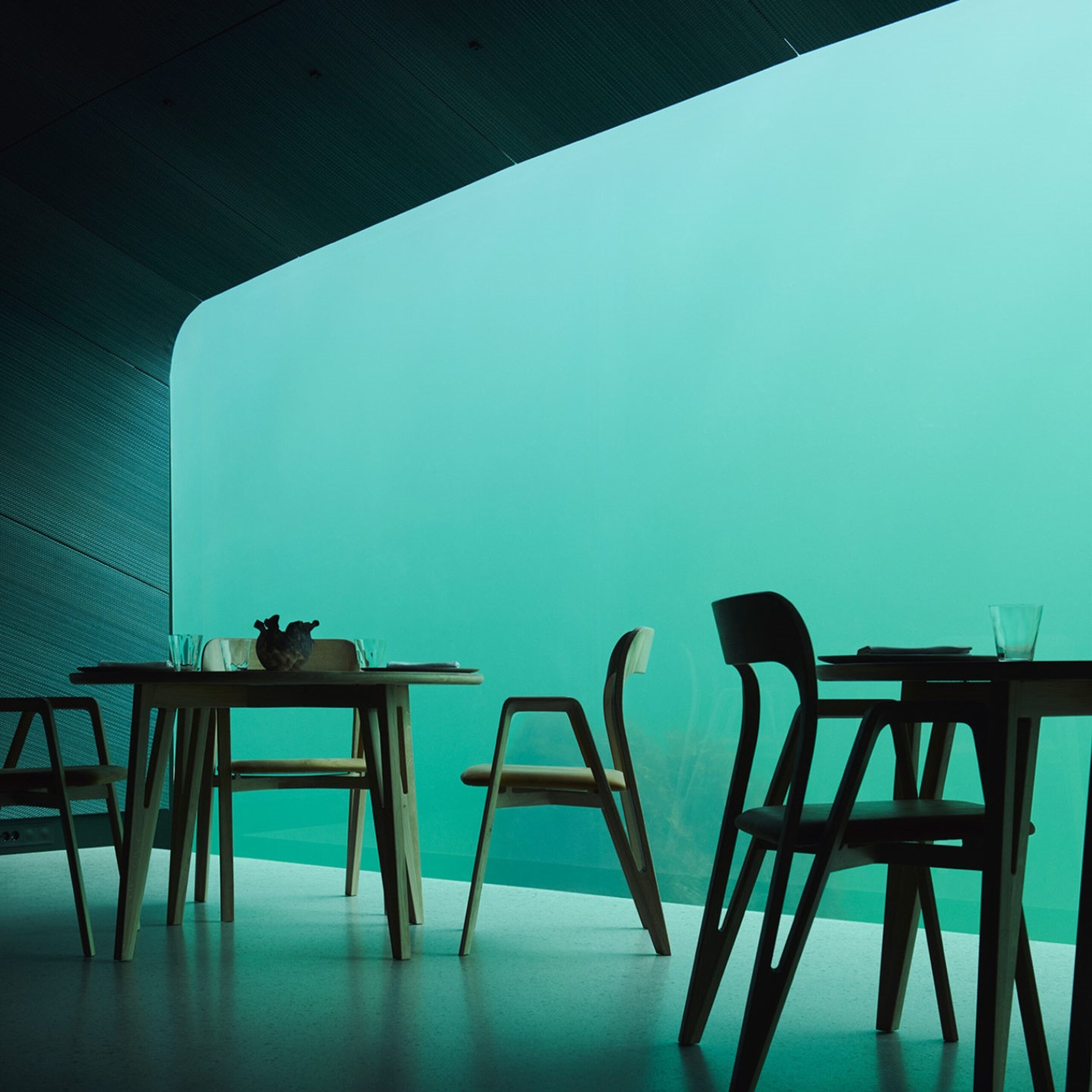 Located near Lindesnes, Under looks like an oblong box that juts out of the sea at a 45° angle, according to an article by National Geographic. Guests must climb down a staircase as they enter the establishment, which leads them to a minimal yet stylish dining space with a window that provides a view of marine creatures at five and a half meters below sea level.