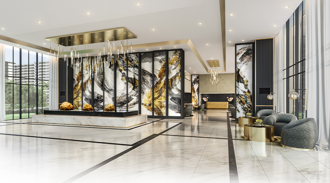 Gold Residences, the residential enclave within Gold City, remains elegant in its simplicity with a modern façade by architectural firm ASYA Design that contrasts light and dark tones to create a visual of depth. Singapore-based Michael Fiebrich Design creates interiors that transform this residential space into a regal compound with lofty art panels in lobbies, playful geometries for ceiling light fixtures, and gold trimmings that add an undeniable touch of refinement. Intimate pockets of natural calm and vibrant communal areas are masterfully landscaped outdoors by Hong Kong-based Adrian L. Norman Limited.