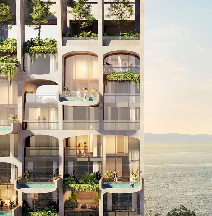 “With their generous outdoor terraces and private plunge pools, both suites and sky villas attain the notion of individual, floating bungalows with sweeping sea views,” the firm writes in an Instagram post. “The resort is simultaneously expansive and individual, a vertical frame of reference that contains a collection of individual experiences.”
