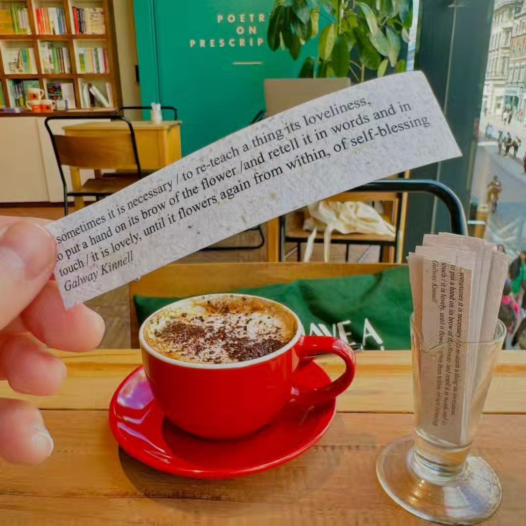 Visitors can receive poetry pill “prescriptions” based on how they’re feeling, which staff will pack into cute paper bags when they purchase them. Should visitors need a bite or warm drink, The Poetry Pharmacy also delivers with its in-house coffee shop selling beverages and cakes. Every detail in the store is a fun and innovative reminder about the impact and even healing power of words.